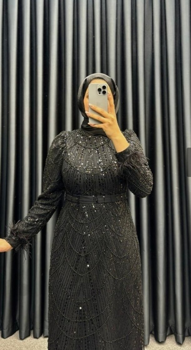 Fitted kesim siyah abiye elbise, yüksek yakalı, uzun kollu ve boncuk işlemeli detaylara sahip, mütevazı ve göz alıcı bir parti görünümü için uygun. ürün 3 saat giyildi. üründe hiçbir tadilat yoktur