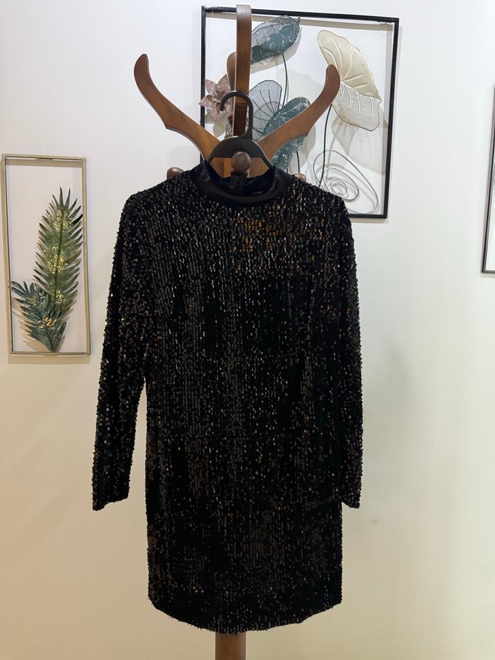 Boncuk İşlemeli Siyah Uzun Kollu Elbise