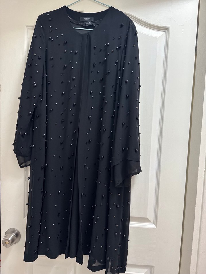 Boncuk işlemeli, siyah uzun kollu, bol kesim kadın elbisesi. Modest gotik tarzda, ofis kullanımı için uygun, yakası kesikli ve desensiz.46 beden