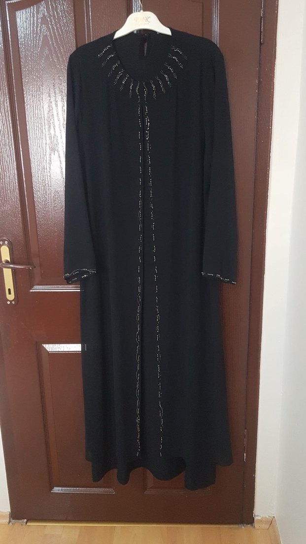 Bir kere giyildi Uzun kollu, siyah ve boncuk işlemeli bu tesettür elbise, notched lapel yakaya sahiptir. Sentetik kumaştan üretilmiş olup ofis için uygundur.