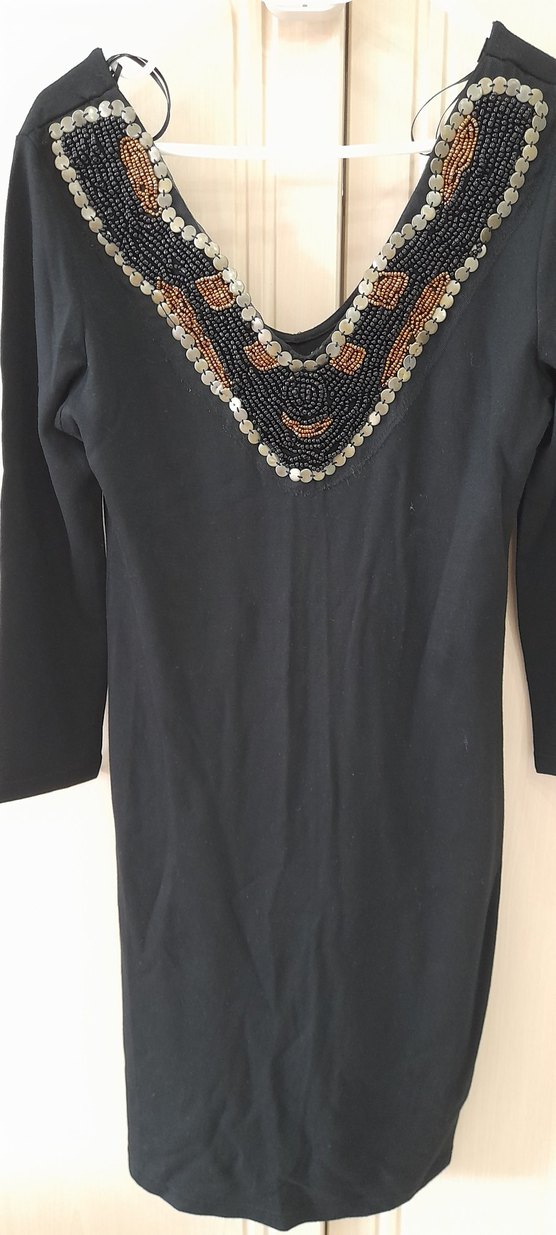 Uzun kollu, V yaka ve boncuk işlemeli siyah dar kesim elbise. Bohem tarzıyla romantik geceler için uygun.