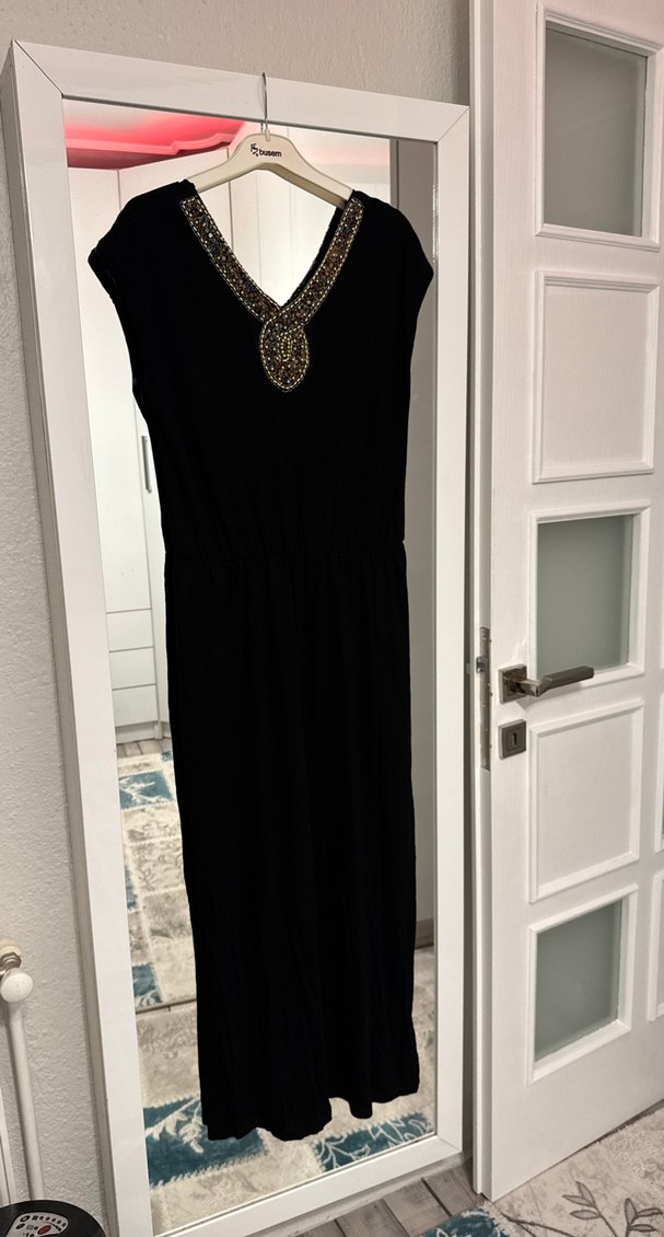 Boncuk işlemeli ve nakış detaylı V yaka, kolsuz siyah uzun elbise. Klasik, vintage goth tarzını yansıtan, düzenli kesim, Penye beli lastikli astarlı günlük elbisedir.38/40/42 olur.