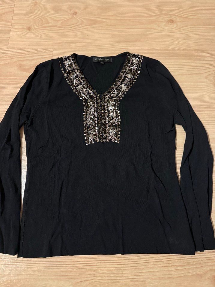 Siyah, V yaka uzun kollu bluz, boncuk işlemeli detaylara sahip. Yumuşak sentetik kumaştan, bol kesim bohem tarzda. boncuklarında herhangi bir eksik yok
