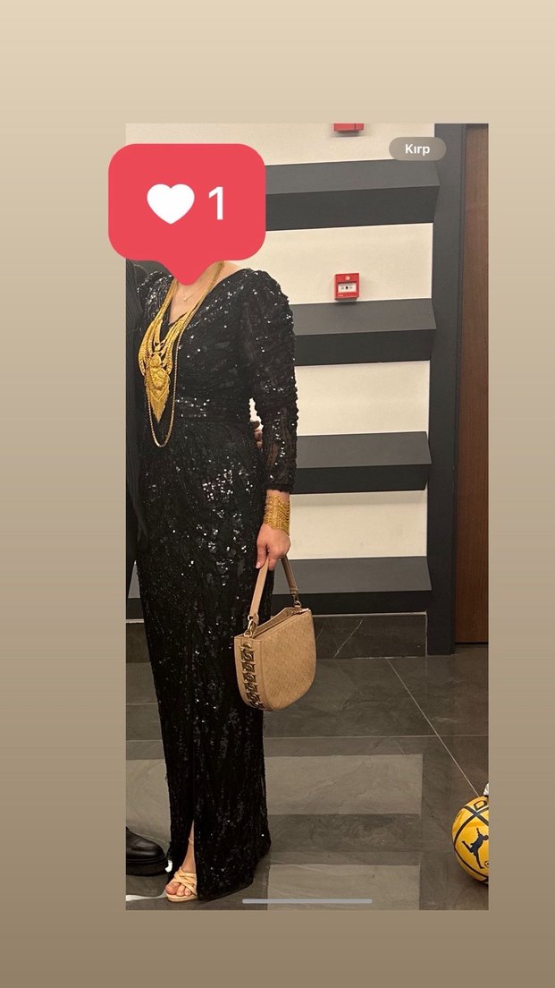 Boncuk işlemeli, yılan desenli siyah uzun abiye elbise, V yaka ve askılı kollara sahip. Gotik ve avangart tarzda, parti için uygun.