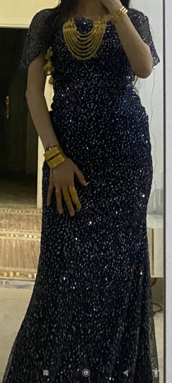 Boncuk işlemeli, yılan desenli, V yaka ve askılı uzun siyah abiye elbise, klasik şıklık için uygundur. bir kere giyilmiş