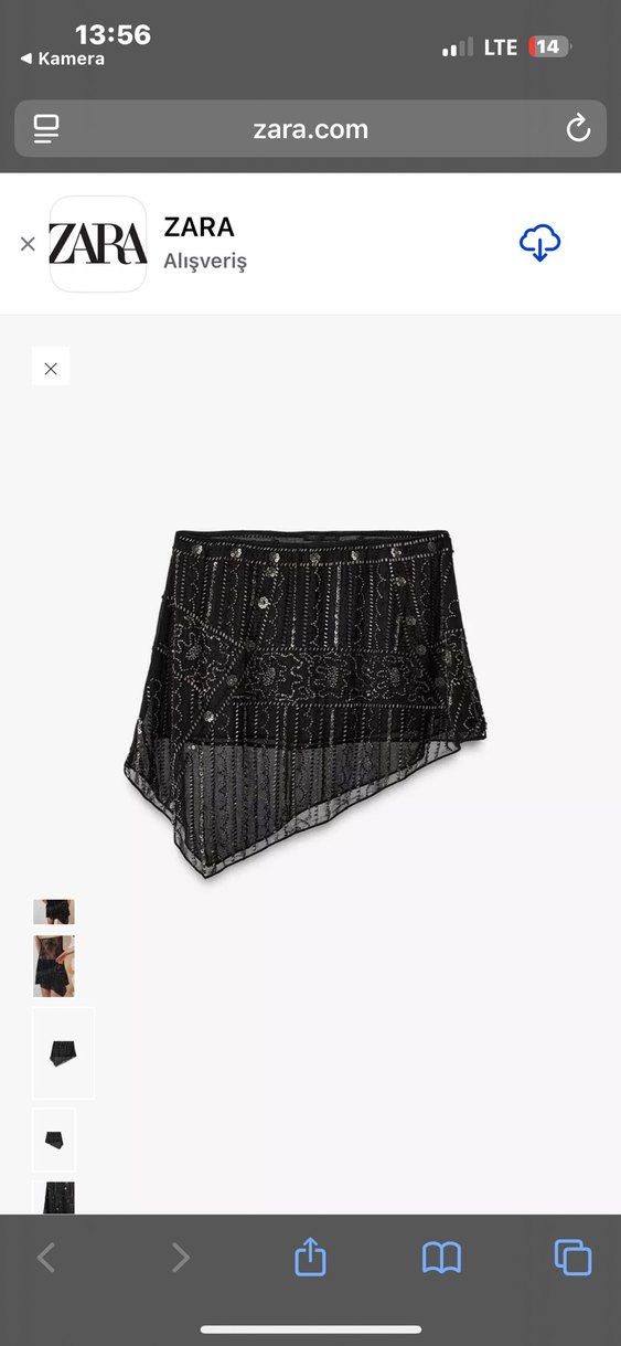 Boncuk işlemeli ve nakış detaylı, asimetrik kesim siyah mini etek. Hiç giyilmedi. Tek kol bluz olarakta kullanılabilir ben o amaçla almıştım ama çok benzer bi eteğim varmış zaten