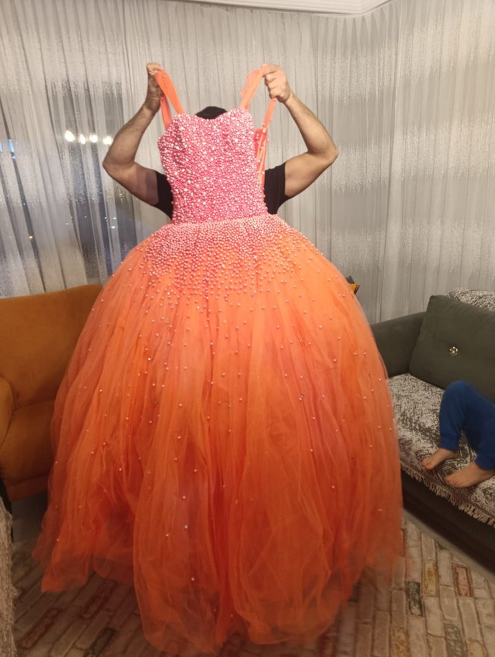 Boncuk işlemeli, straplez, vücuda oturan midi elbise, parlak pembe-turuncu geçişli. Kolsuz ve gösterişli nişan ya da düğünler için uygun. ✨