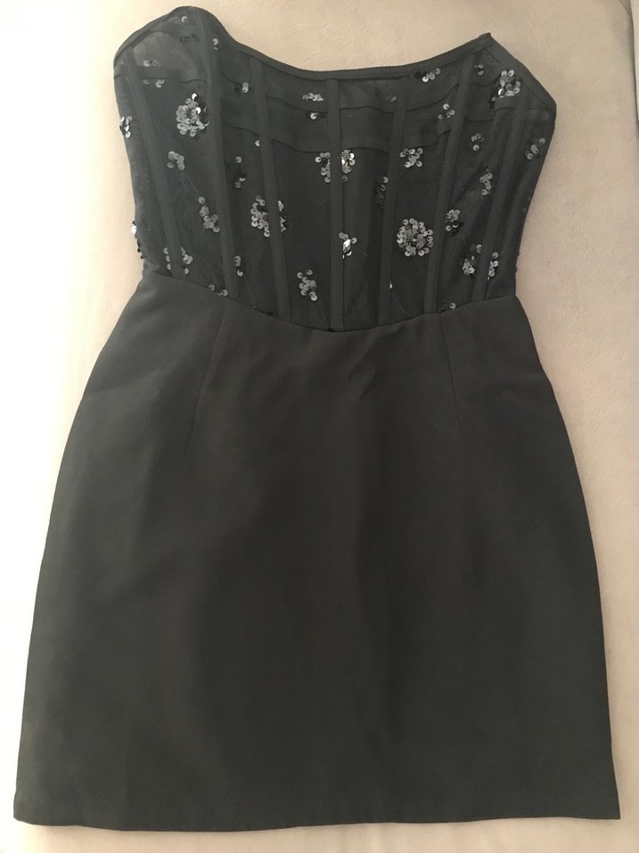 Bu siyah elbise, straplez ve kolsuz tasarıma sahiptir. Gövdesi boncuk işlemeleriyle süslenmiş, gotik ve avangart bir hava katar, romantik akşamlar için uygundur.