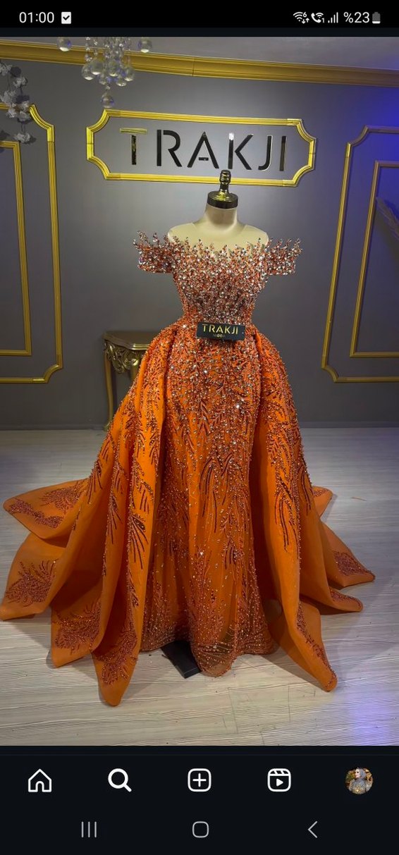 fiyat 35 bin, uzun kol parcasida var Parlak turuncu kumaş üzerine boncuk işlemeli, straplez ve kısa kollu uzun, vücuda oturan kadın abiyesi, gösterişli düğünler için uygundur.