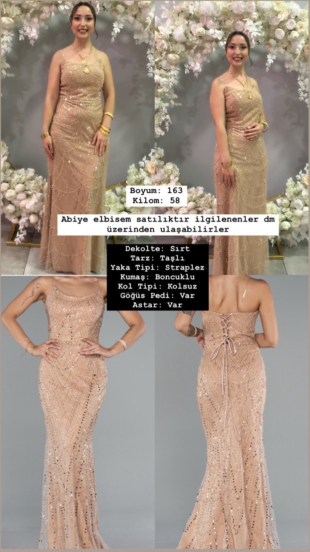 Boncuk işlemeli, straplez yaka ve kolsuz tasarımlı uzun bej abiye elbise. Sırt bağcık detaylı, göğüs pedli ve astarlıdır. Düğün için uygundur. ✨ boyum 163 kilom 58 pazarlık payı vardır