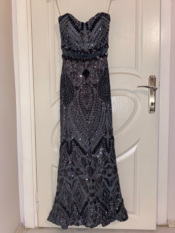 Boncuk İşlemeli Straplez Uzun Gri Abiye Elbise