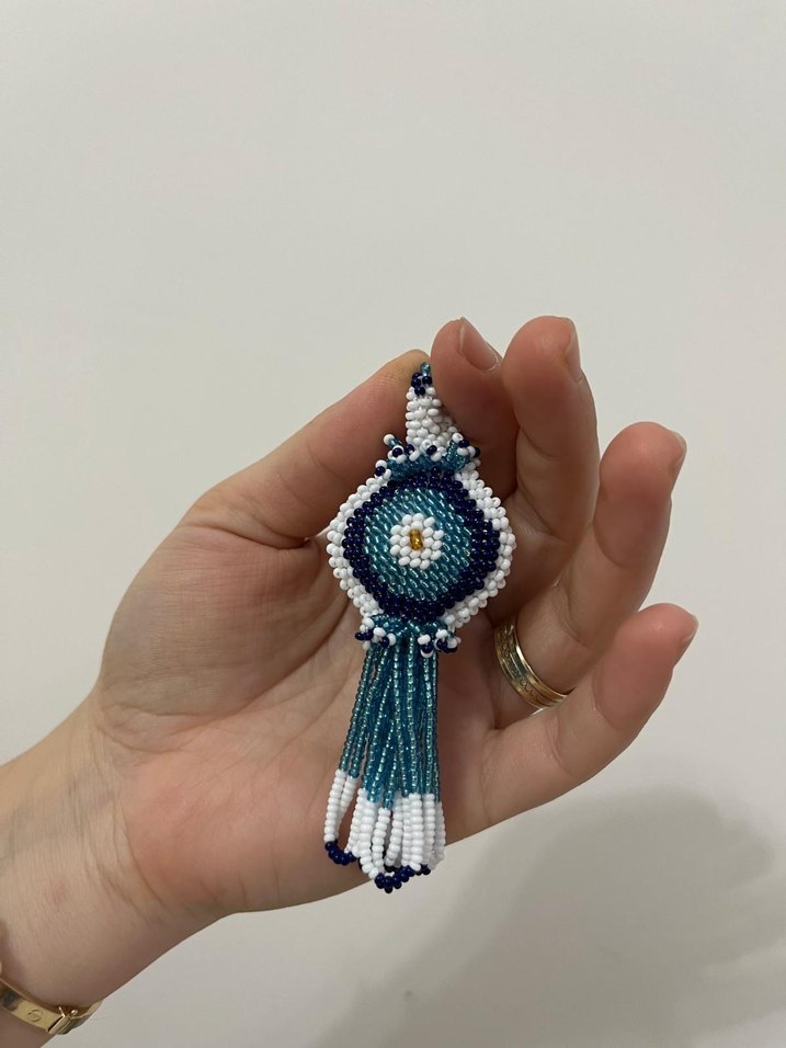 Turkuaz ve beyaz boncuklarla işlenmiş, püsküllü bohem tarzda anahtarlık. Retro ve hippie tarzlara uyum sağlar.