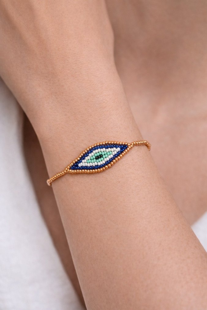 Turkuaz ve mavi tonlarda işlemeli boncuk detaylı, bohem tarzda günlük kullanıma uygun bileklik.