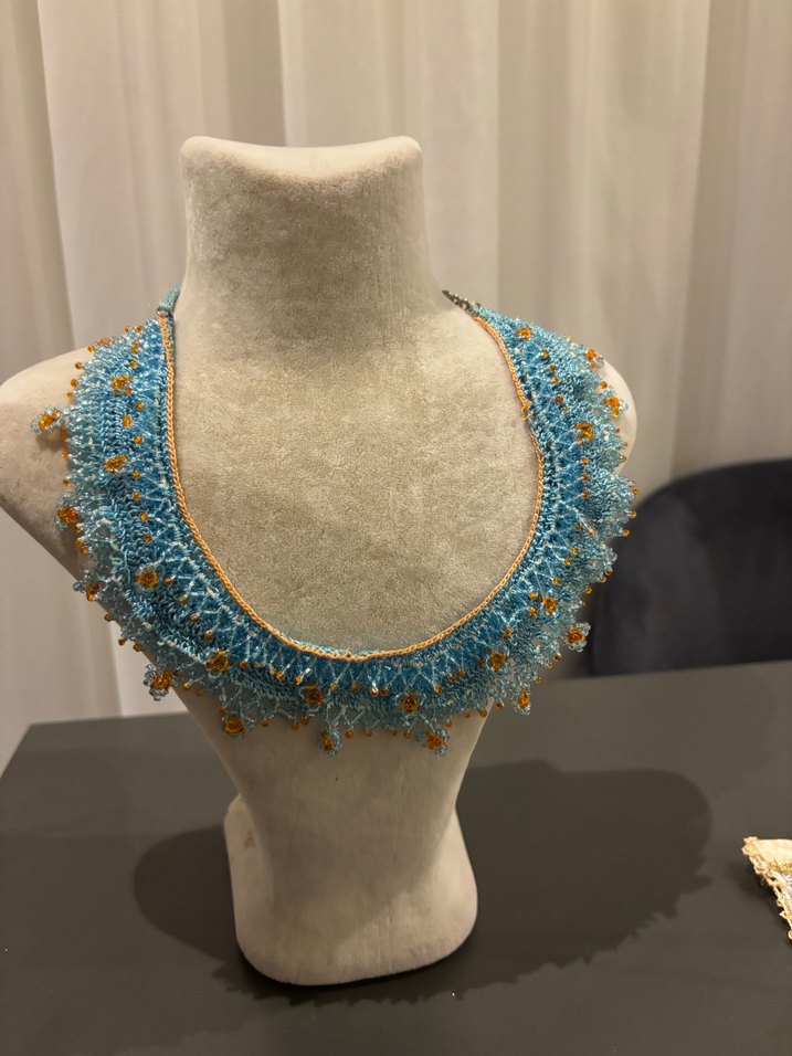 Bu kısa, boncuk işlemeli kolye, renkli turkuaz işlemeleriyle bohem tarzını yansıtıyor, günlük kullanıma uygundur. İğne oyası, boncuk ve doğal taş ile tasarlanmıştır. El yapımıdır. Bir kadın girişimciye destek için satıyorum.