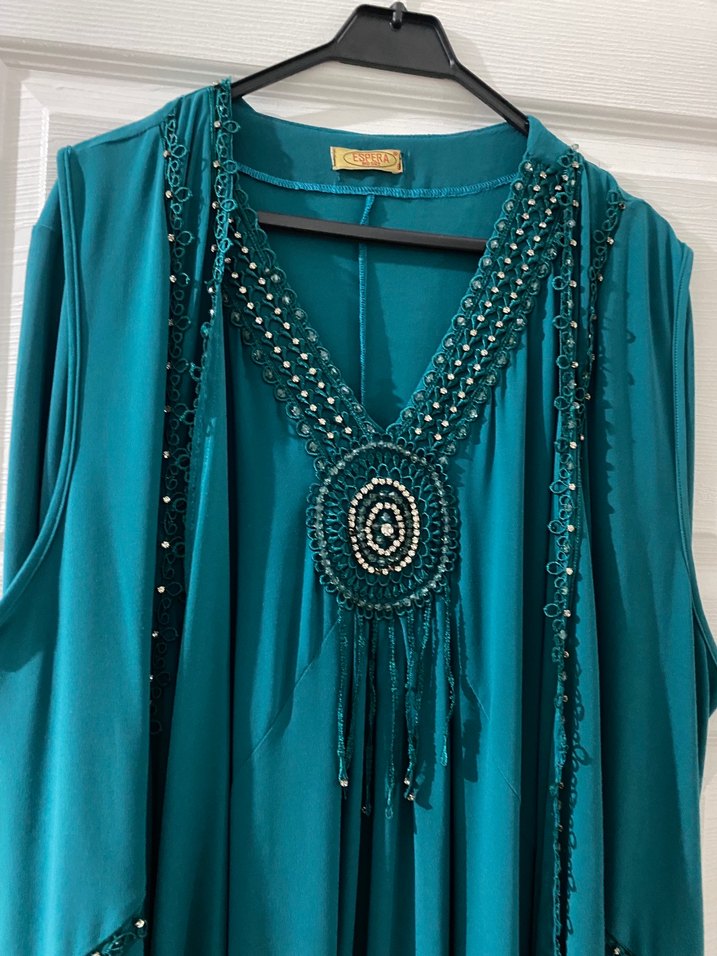 İçli dışlı V yaka ve kolsuz tasarıma sahip turkuaz uzun elbise, boncuk ve işlemeli detaylarla süslenmiştir. Bol kesim ve parlak dokusuyla bohem tarzı yansıtır. 48-56 beden uyumlu