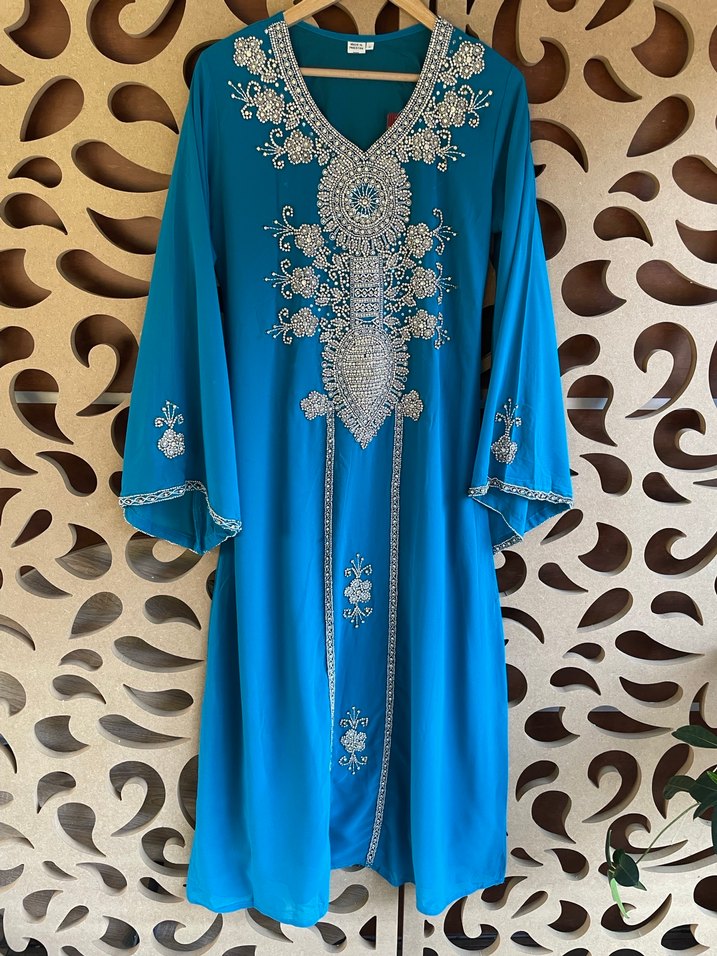Uzun kollu, V yaka ve boncuk işlemeli detaylara sahip turkuaz bohem elbise. İpek gibi kumaştan, bol kesimli ve düğünler için uygun.