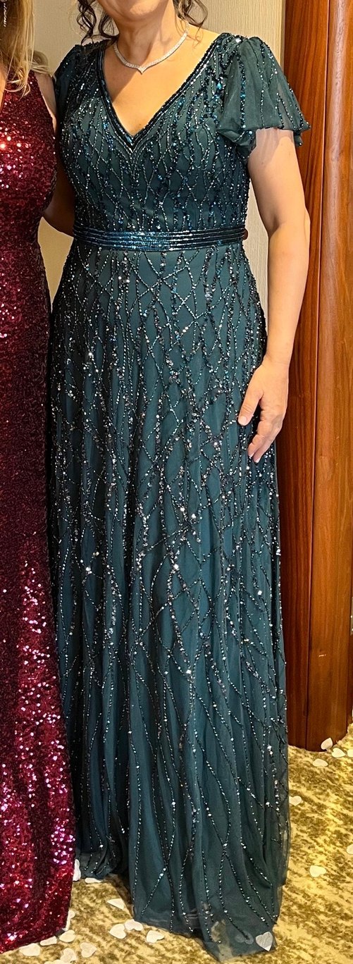 Turkuaz renkli, boncuk işlemeli uzun abiye elbise. Göğüs ve sırtı V yakadır kolları bolen kesim yapılmıştır, vücuda oturan kesimiyle düğünler için şık ve bohem bir tarz sunar.
