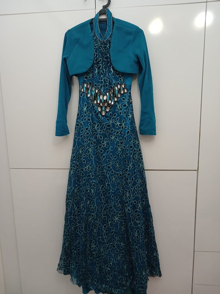 Boncuk İşlemeli Turkuaz Uzun Abiye Elbise