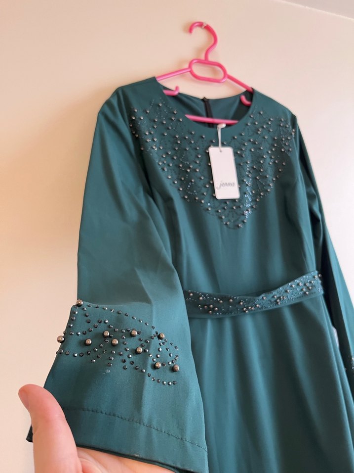 Boncuk işlemeli, turkuaz uzun elbise. Yuvarlak yaka ve uzun kollu, bol kesim. Gövde, kol ve bel kısmında parlak işlemeler bulunur.