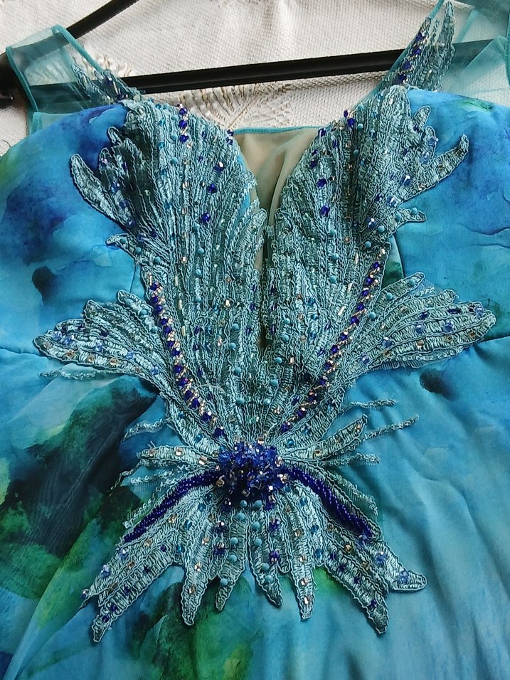 Turkuaz renkli, v yaka, kolsuz ve uzun boy abiye elbise. Parlak boncuk işlemeleri ve nakış detaylarıyla süslenmiştir, düğünler için şık bir tercihtir.
