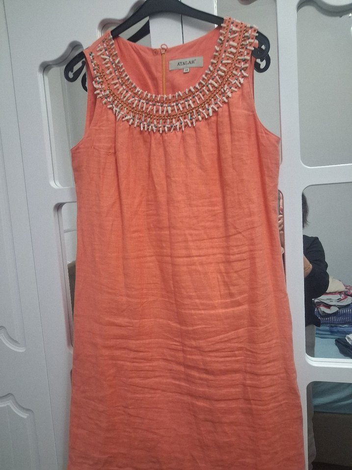 Kolsuz, turuncu midi elbise, bol kesim ve yuvarlak yakada parlak boncuk işlemeleriyle bohem tarzını yansıtıyor. Günlük kullanıma uygun.