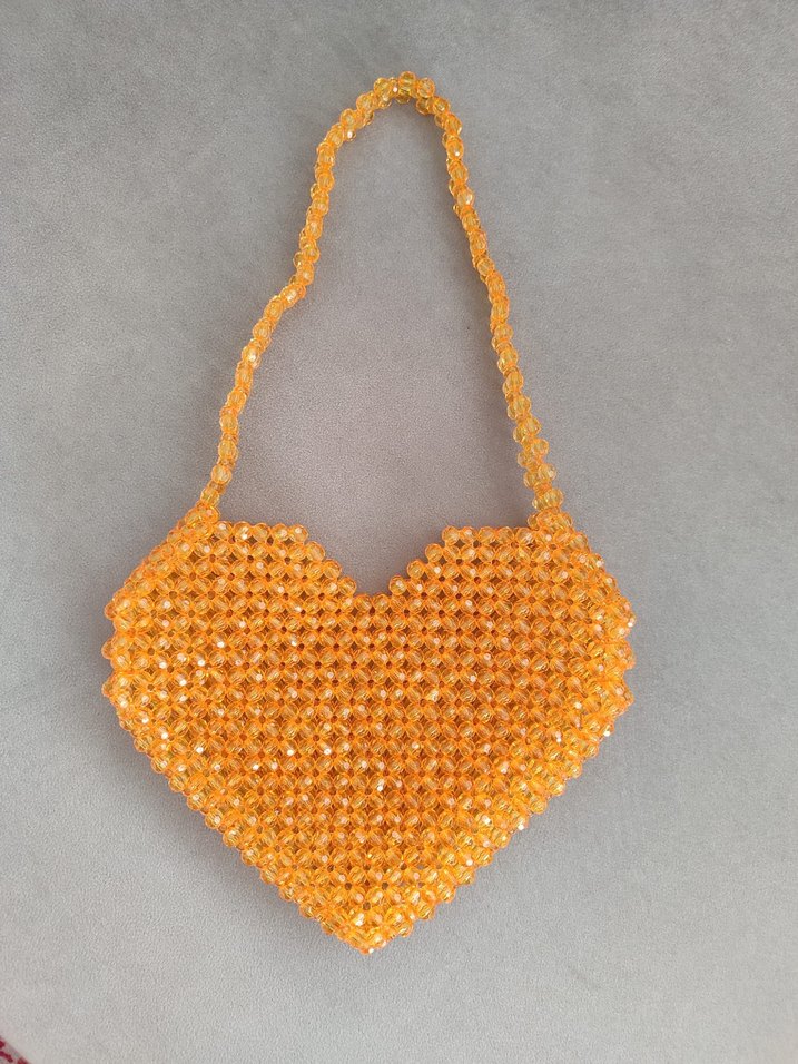 Parlak boncuklarla süslenmiş turuncu örgü kadın çanta, kalp şeklindedir. Günlük kullanıma uygun bohem tarzı yansıtır.