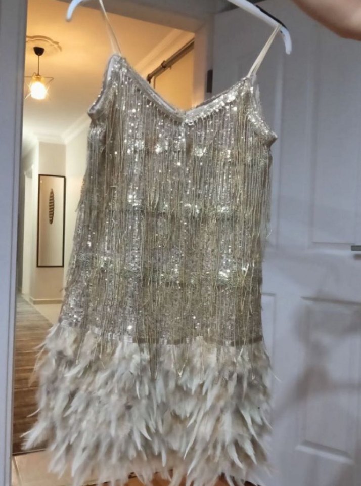 Bej renkli, straplez yaka ve kolsuz olan bu gece elbisesi, boncuk işlemeli parlak detaylara ve etek kısmında tüy süslemelerine sahiptir. Parti için uygundur. ✨