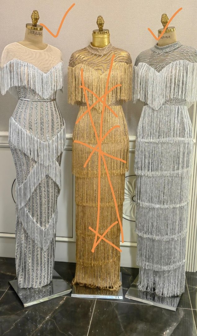 Boncuk işlemeli ve püskül detaylı uzun, vücuda oturan abiye elbise. Çok renkli seçeneklerle avant-garde parti tarzına uygun.