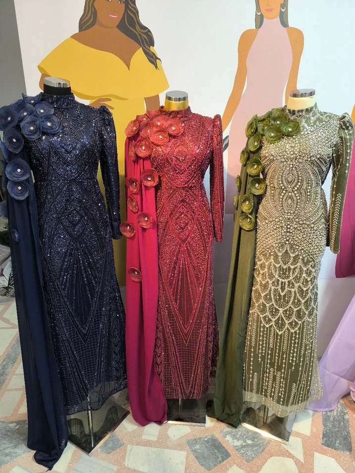 Boncuk işlemeli desenlere ve omuzlarda çiçek detaylarına sahip uzun abiye elbiseler. Lacivert, kırmızı ve haki renk seçenekleri, uzun kollu ve dramatik bir görünüm için pelerin detaylıdır.