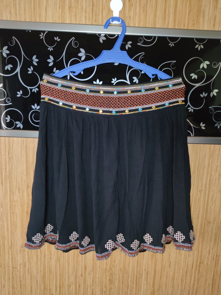 Boncuk işlemeli, midi ve bol kesim hamile eteği. Koyu renkli tekstil kumaş üzerine çok renkli işlemelerle bohem tarzda, günlük kullanıma uygun. Beli lastikli 38-40 beden uyumludur.
