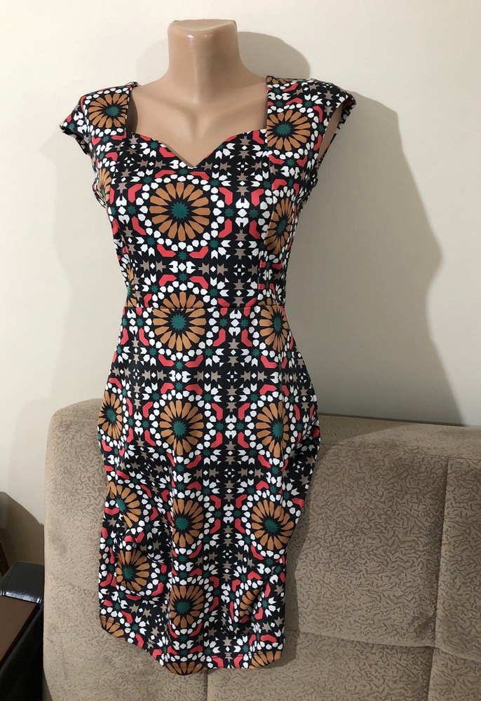 Boncuk işlemeli, desenli uzun kadın kalem elbise. Tekstil kumaştan, dar kesim ve kayık yaka, kolsuz tasarım bohem tarzını yansıtıyor.