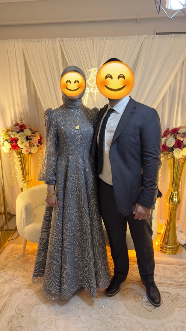 Boncuk işlemeli, etnik desenli uzun gri elbise, notalı yaka ve uzun kollu. Modern klasik ve avangard tarzı birleştirir, düğün ve nişan için uygun.