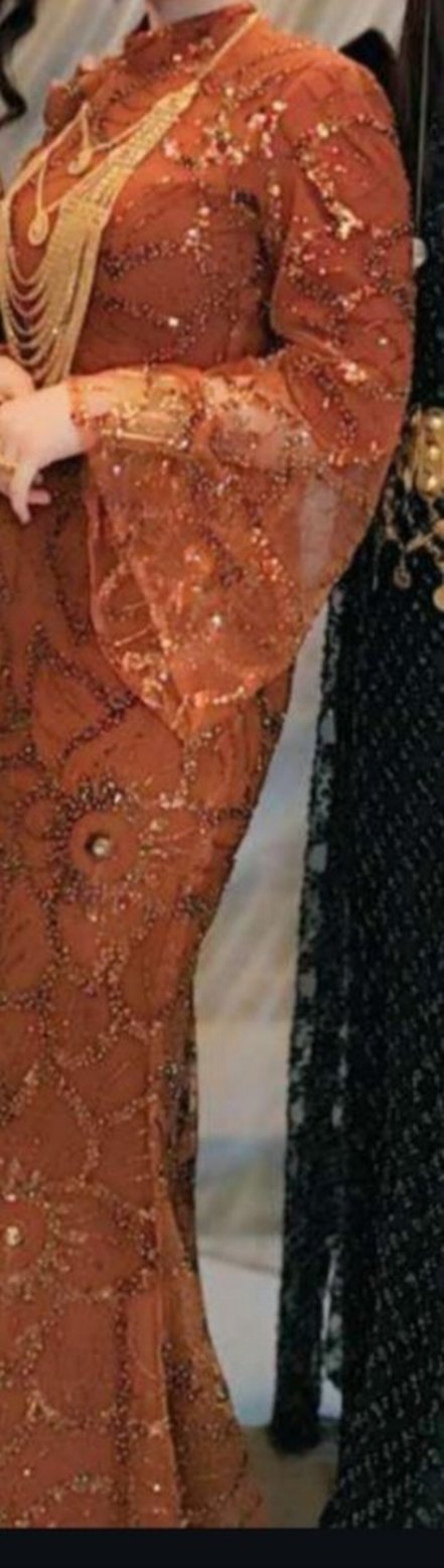 Boncuk işlemeli, işlemeli desenlere sahip uzun, kiremit rengi henna elbise.düğünler için uygundur.