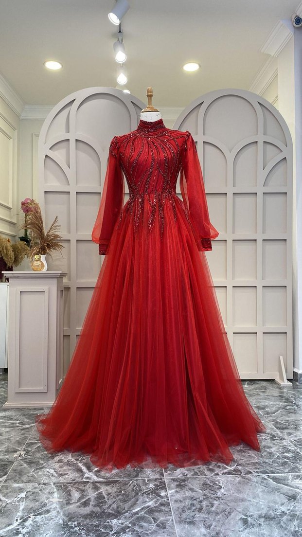 Uzun kollu ve yüksek yakalı kırmızı kınalık, renkli boncuk işlemeleriyle süslenmiş. Normal kesim ve uzun etekli, düğünler için uygun.
