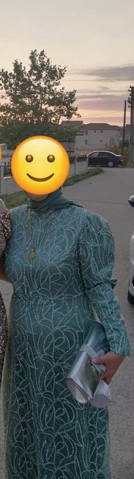 Boncuk İşlemeli Uzun Kol Turkuaz Elbise