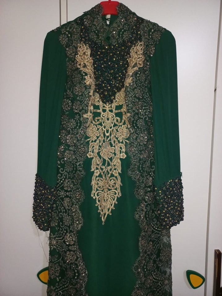Boncuk işlemeli, uzun kollu ve yüksek yakalı, klasik ve avangart tarzda, düğün için uygun yeşil renkli uzun elbise.