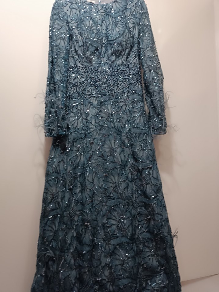 Boncuk işlemeli, uzun kollu, tekne yaka abiye elbise. Gevşek kesim ve bohem tarzıyla düğünler ve şık etkinlikler için uygundur. Bir kez giyildi.