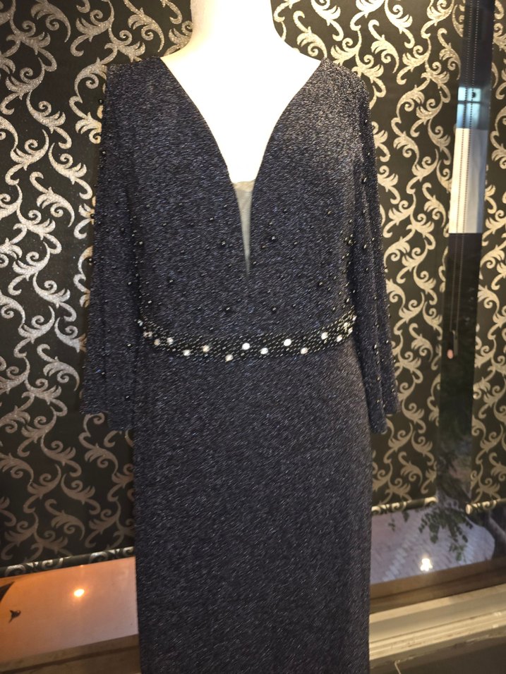 Bu uzun gri abiye elbise, V yaka ve uzun kolludur. Boncuk işlemeleriyle zarif bir görünüm sunar ve düğünler için uygundur.