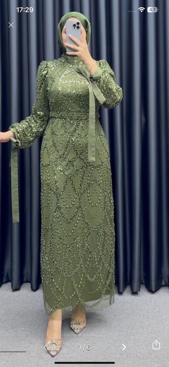 Haki renkli, yüksek yakalı ve uzun kollu bu uzun abiye elbise, parlak boncuk işlemeleriyle süslenmiştir. Düğünler için uygun, tesettür ve normal kesimdir. ✨ sadece 3 4 saat giyildi