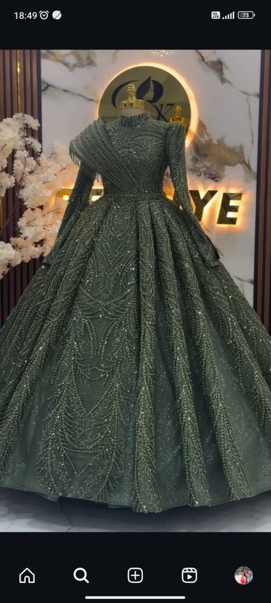 Boncuk işlemeli, uzun kollu ve yüksek yakalı khaki renkli, klasik tarzda, düğün için uygun uzun abiye elbise. Parlak işlemeleriyle dikkat çeker. ✨
