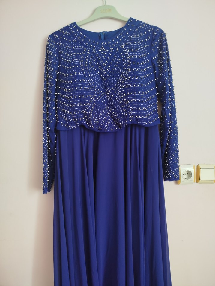 Boncuk işlemeli, uzun kollu ve yuvarlak yakalı bu uzun, bol kesim abiye elbise, parlak mavi renkte olup düğünler için şık ve klasik bir görünüm sunar.