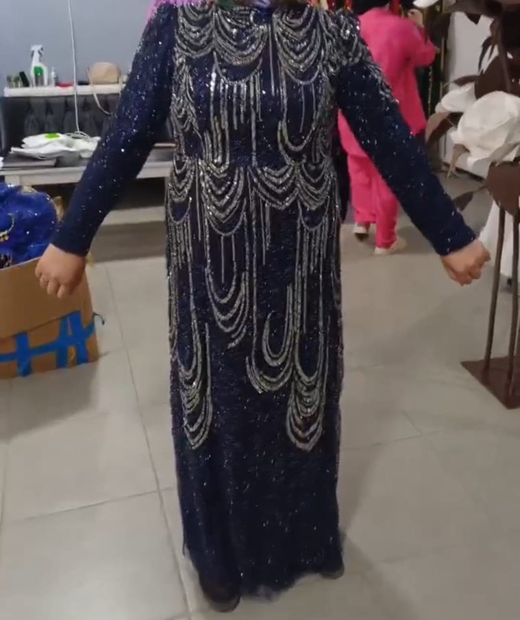Boncuk işlemeli desenlere sahip, uzun kollu, mavi ve dar kesim abiye elbise, gösterişli parti için uygundur. ✨
