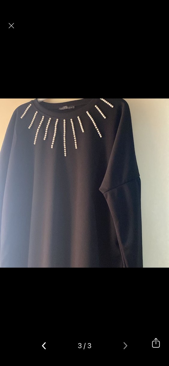 Siyah uzun kollu, yuvarlak yakalı, bol kesim tunik. Yakasında parlak boncuk işlemeleriyle minimalist ve sokak stili uyumlu, yumuşak sentetik kumaştan günlük kullanıma uygun. ✨