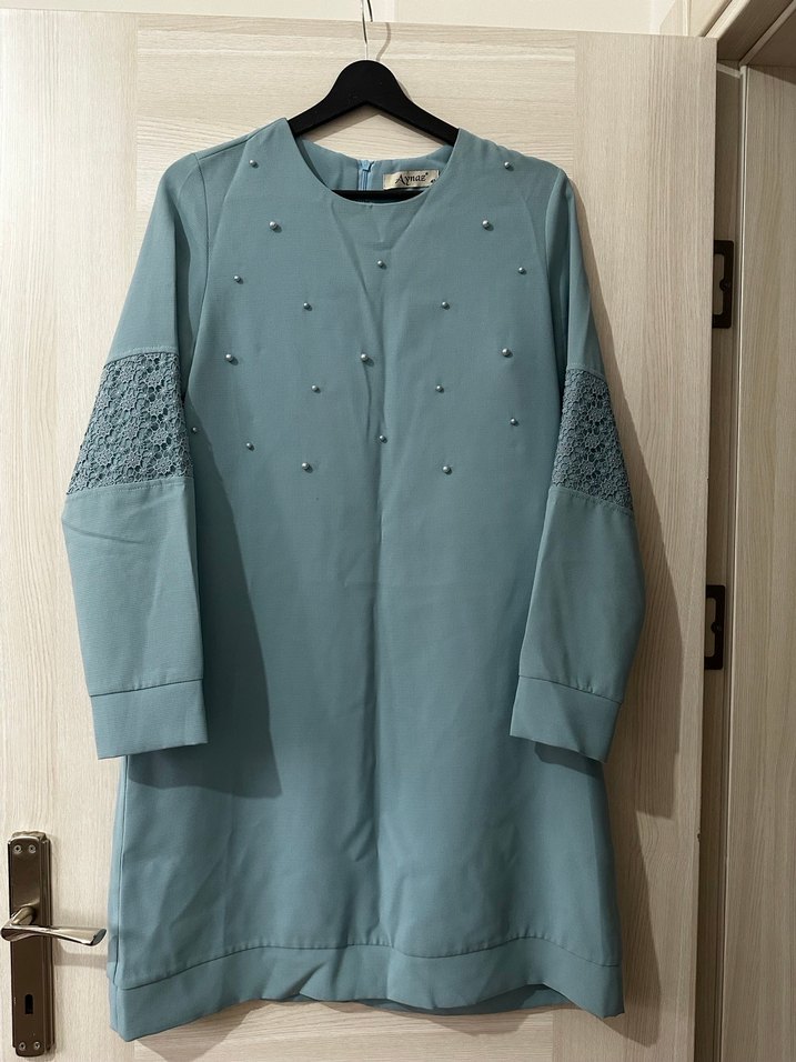 Boncuk İşlemeli Uzun Kollu Turkuaz Tunik