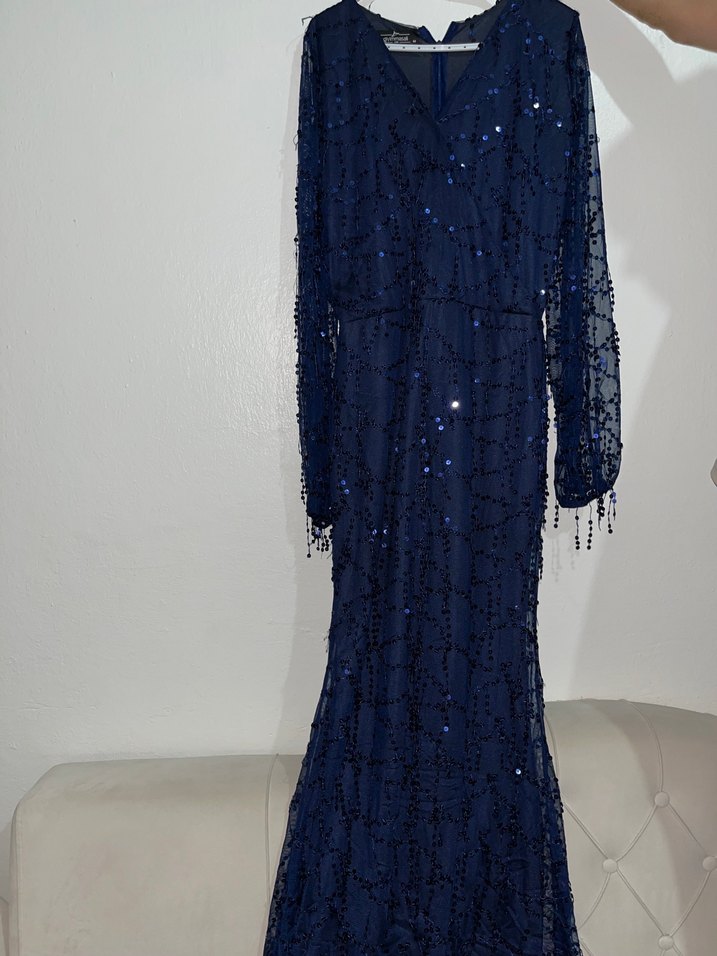 Boncuk işlemeli, uzun lacivert abiye elbise. V yaka ve uzun kollu, şık desenlerle bohem tarzda, mütevazı ve göz alıcı bir modeldir. ✨