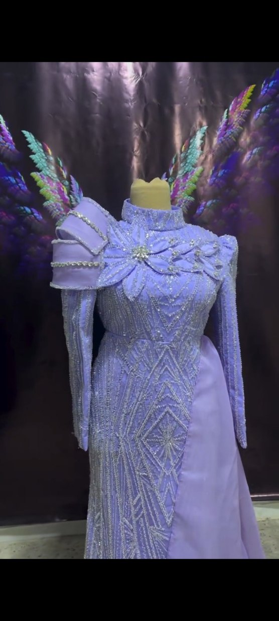 Boncuk işlemeli ve nakışlı detaylara sahip, yüksek yakalı ve uzun kollu uzun mor abiye elbise. Düğünler için uygun, regular kesim ve avangart tarzda. ✨Şal ile beraber 40.42.44 uyumlu tarih sorun
