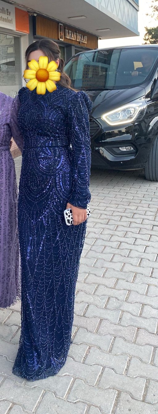 Boncuk işlemeli, desenli uzun mor abiye elbise, dar kesim ve uzun kollu. Notlu yaka detayı ile düğün ve özel günler için uygundur. Elbise sadece iki saat giyildi 7 bine aldım daha yeni