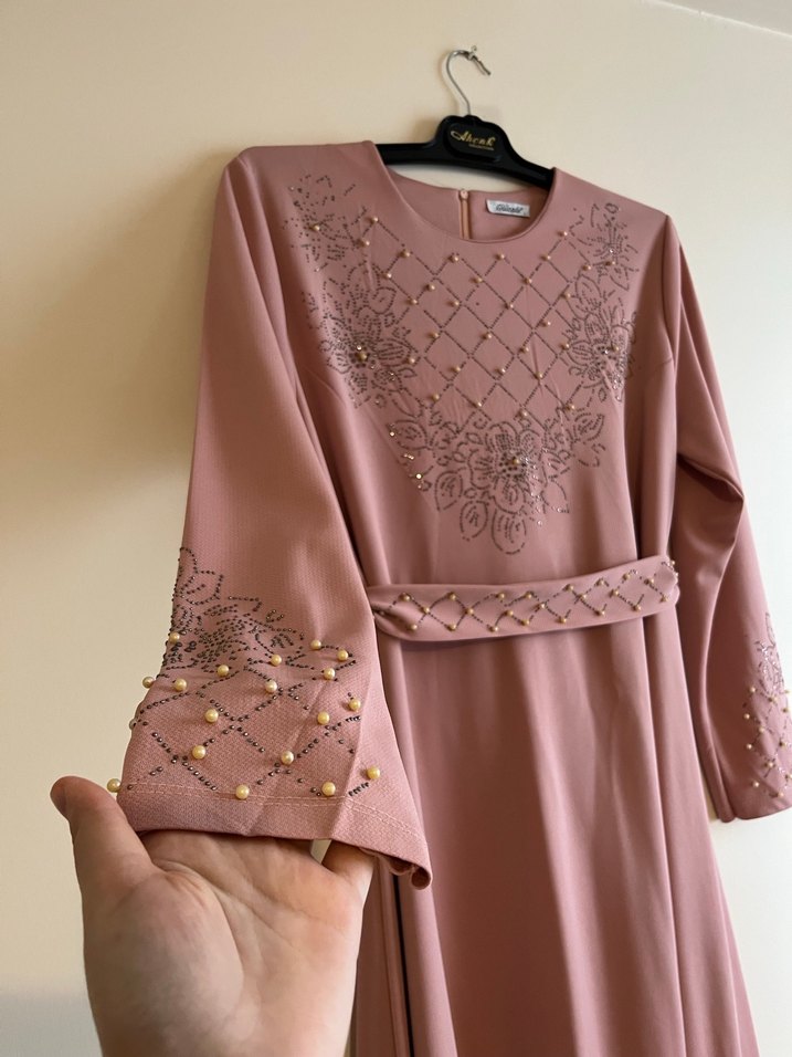 Boncuk ve işlemeli detaylara sahip, uzun pembe kadın elbisesi. Yuvarlak yaka, dar kesim ve klasik tarzda, yumuşak sentetik kumaştan üretilmiştir.