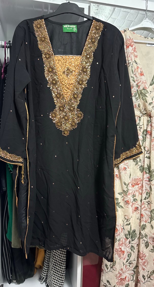 Siyah kadın kınalık elbise, bol kesim ve uzun kollu olup V yaka ve manşetlerde boncuk ve işlemelerle süslenmiştir. Düğün gibi özel günler için uygundur.