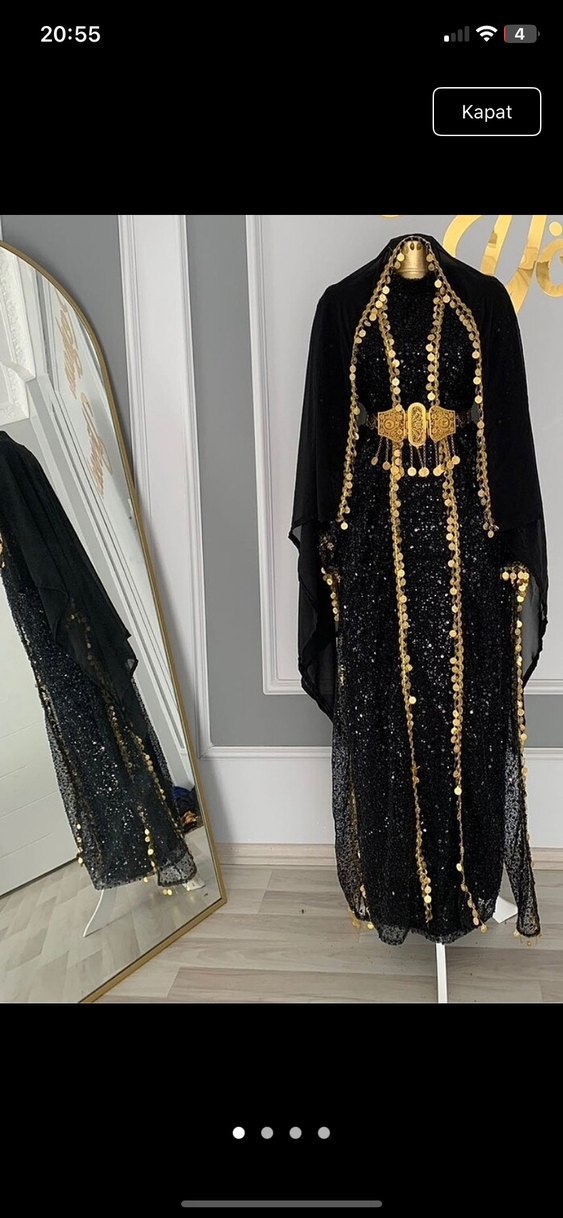 Bu uzun, bol kesim kadın kına elbisesi yüksek yakalı ve askılı kolludur. Altın işlemeler ve boncuk detaylarıyla süslenmiştir, düğünler için uygundur. Parlak ve mütevazı bir tarz sunar. ✨